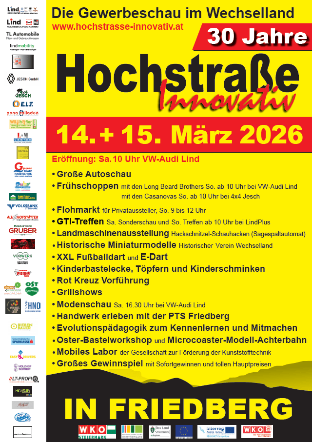 Ein Meilenstein steht bevor! Am 14. und 15. März 2026 feiert die renommierte Wirtschafts- und Gewerbeausstellung „Hochstraße Innovativ“ in Friedberg ihr 30-jähriges Jubiläum. Das Organisationsteam rund um Mario Janisch, Andreas Jesch, Dagmar Ajtic, Esther Lang und Patrick Faustmann bereitet sich darauf vor, über 60 Aussteller und Gäste zu einem Wochenende voller Highlights zu begrüßen.